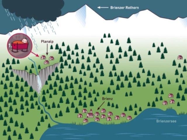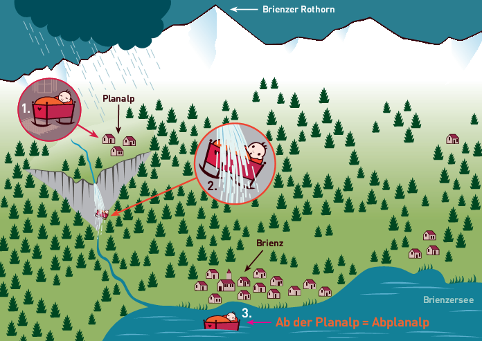 Zum Namen "Abplanalp" gibt es eine Geschichte mit zwei Varianten. Der Legende nach wurde die Siedlung Planalp, die ganzjährlich bewohnt war, ums Jahr 1000 durch eine Lawine völlig zerstört. Es überlebte nur ein Säugling in einer Wiege, die schwimmend auf dem Brienzersee gefunden wurde. Der Säugling erhielt den Namen "Abplanalp" (Ab der Planalp). Mein Grossvater erzählte dieselbe Geschichte, aber anstatt auf einer Lawine wurde das Kind bei einem Unwetter den Mülibach hinunter in den See geschwemmt. Für die Postkarte und die Animation wurde die 2. Variante als Vorlage genommen.